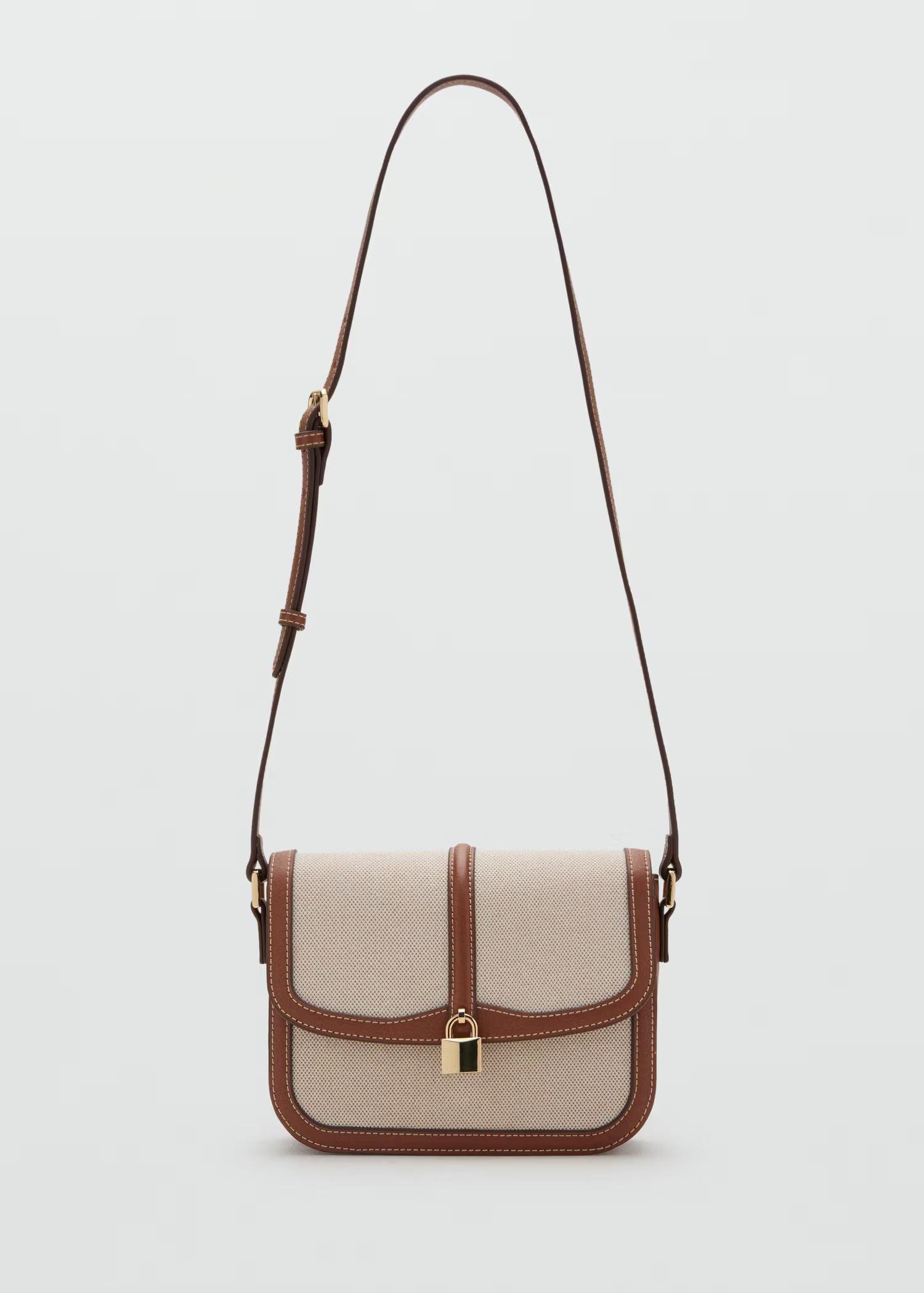 Canvas fabric. Small size. Crossbody bag design. Charm detail. Two compartments. Flap closure with snap button. Inner lining.