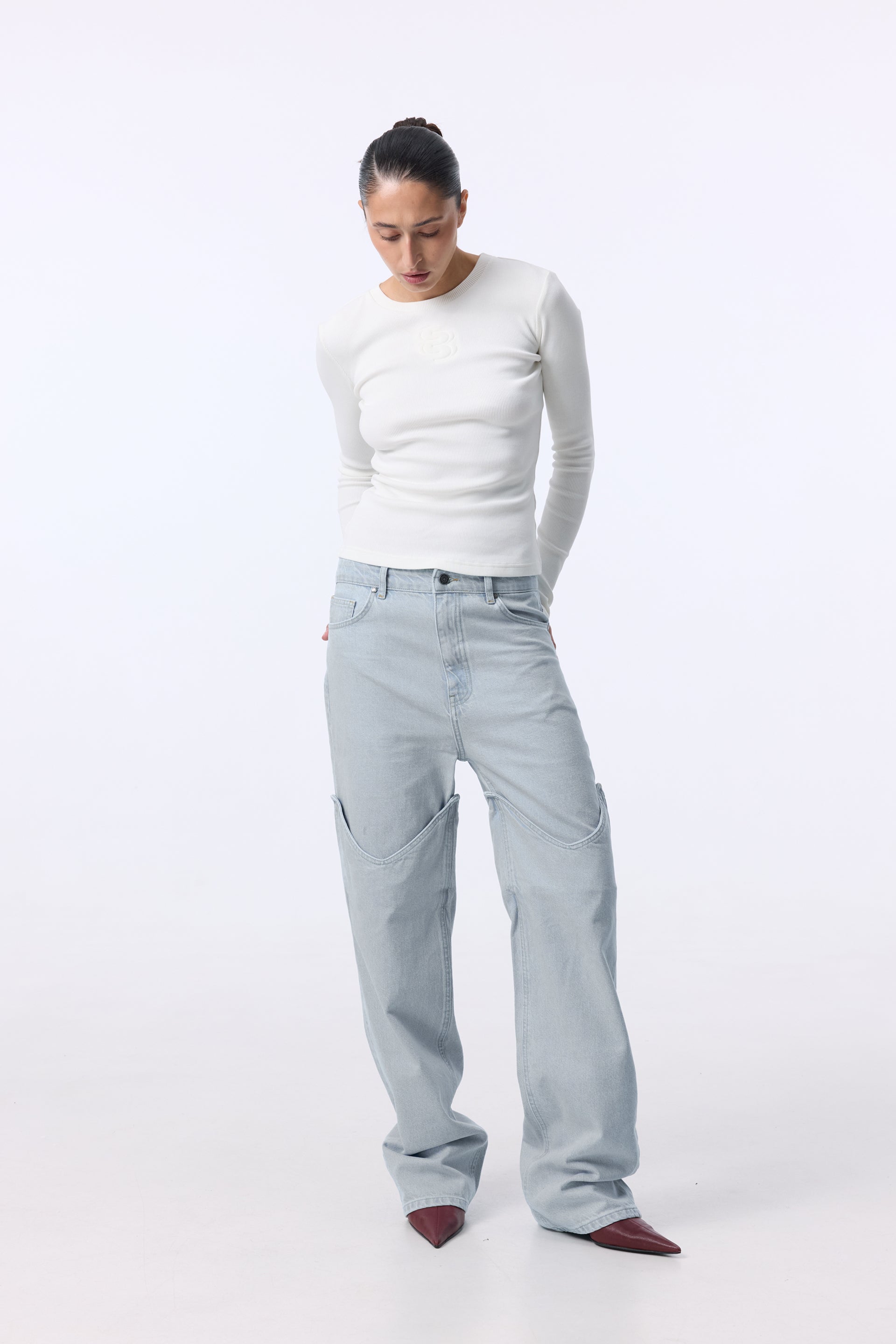 Cowboy jeans are a unique combination of classics and modern experimentation with shape. Made of cotton, they have a straight, loose cut and