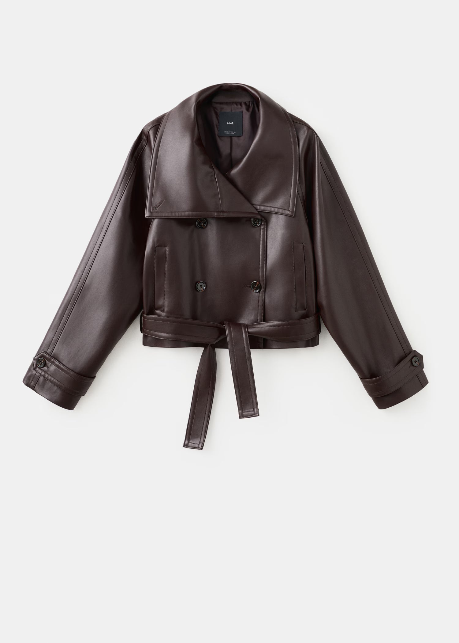 Faux leather. Straight design. Short design. Crossover collar with lapel. Wide lapels. Long sleeves with buttoned cuffs. Two side pockets. Double button fastening. Nightgown-style belt. Inner lining.