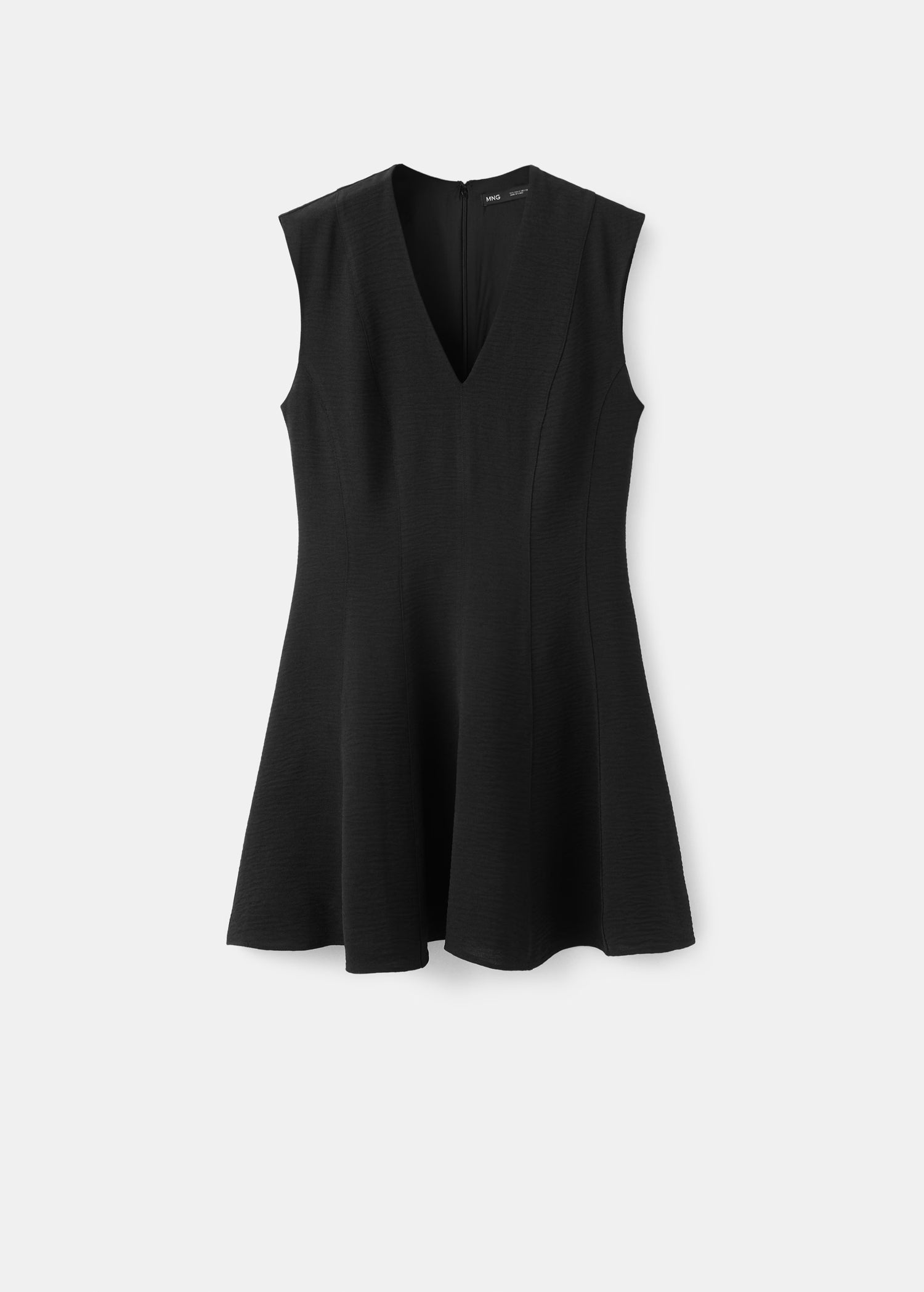 Short design. A-line design. V-neck. Sleeveless. Wide straps. Ruffle hem. Zip fastening on the back section. Inner lining.