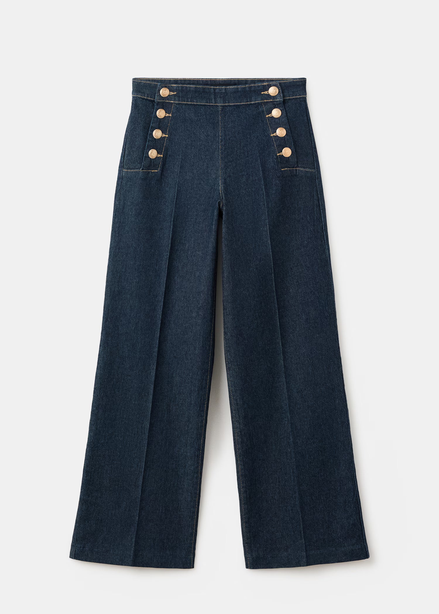 Denim-style cotton fabric. Wide-leg design. Long design. High Waist. Side button fastening. Two back welt pockets. Available Plus.